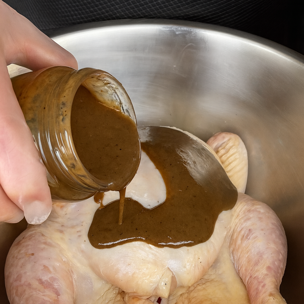 El uso correcto de este adobo consiste en untar el pollo y dejarlo reposar, haciendo que todos sus sabores penetren en cada parte del pollo y así poderlo cocinar a la parrilla, colgado, espiedo, mariposa o al horno.