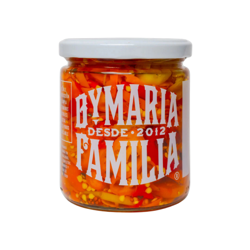 Una explosiva combinación de ajíes frescos de temporada, cortados en finas rodajas y conservados en vinagre de manzana con un delicado toque de cardamomo que eleva su perfil aromático. Equilibrio entre dulzor y fuego. Intensos, vibrantes y con un picor medio a alto 🌶️ perfectos para quienes disfrutan los sabores con carácter.