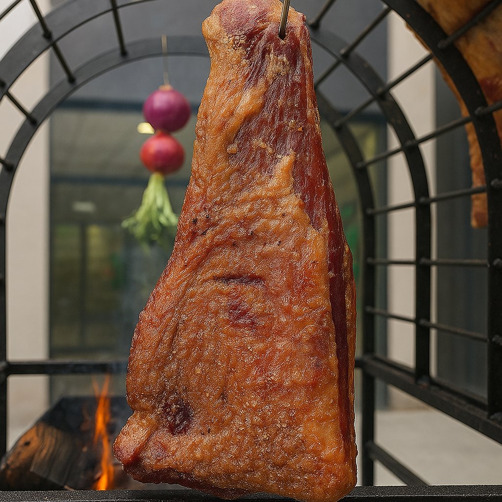 Caracterizado por su distintiva forma triangular y su elegante capa de grasa en uno de sus lados, lo que le otorga un sabor intenso y una textura extraordinariamente tierna. Procedente de un músculo alargado en la parte baja externa del cuarto trasero de la res, es magro pero con la grasa justa para impregnar cada bocado de sabor. Su versatilidad lo convierte en una excelente opción tanto para asar al palo, en la parrilla o al horno, ya sea como pieza completa o mechada con rellenos creativos